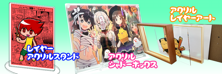 同様に、アクリル板を3~5枚重ねる「アクリルシャドーボックス」「アクリルシャドーボックスマスコット」や、立体額セットの「アクリルレイヤーアート」も、イラストを多層に立体的に魅せるアイテムです。SP(スペシャル)なアクリルグッズで、あなたのオリジナルイラスト作品をより美しく・カッコよく表現してみてください!