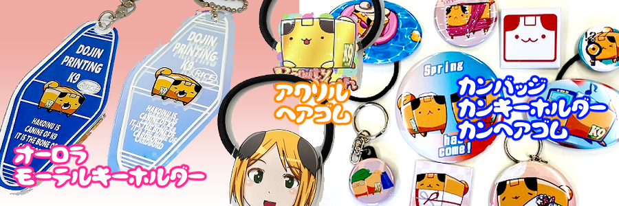 そんな作家さんにおすすめなのが「モーテルキーホルダー/オーロラモーテルキーホルダー」です。細長い菱形の形状の中に、イラストだけでなく文字や模様・ラインデザインを演出するアイテムとなります。形状からデザインするなら通常の「アクリルキーホルダー」「オーロラアクリルキーホルダー」や、「アクリルヘアゴム」も面白いアピールが可能です。また「缶バッジ」「缶キーホルダー」「缶ヘアゴム」なども定番マスコットとして根強い人気です。