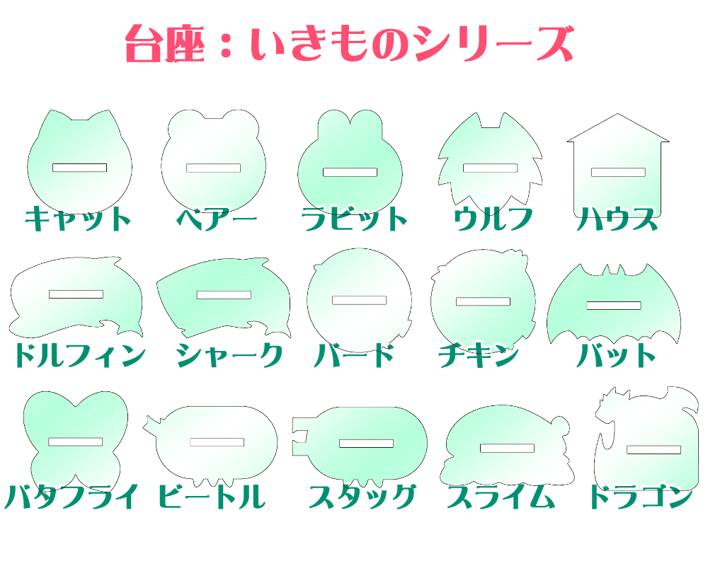 また、アクリルスタンド系商品に付属する台座デザインに、いきものシリーズ15種を追加しました!
