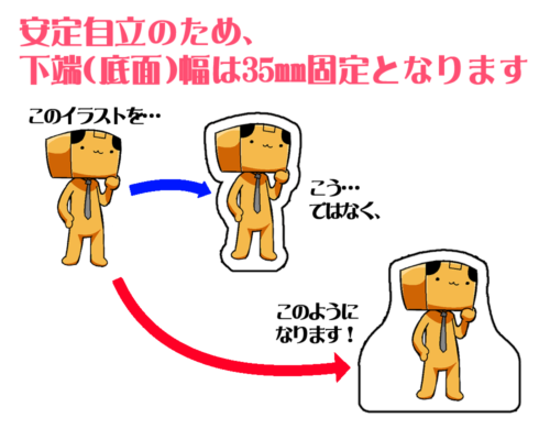 K9のアクリルスタンドは難しいデータの作製不要!イラスト1枚のご入稿でOKです。サイズは35×35㎜内で、自立のため下端(底面)35mm幅固定のカットとなります。しっかりと立つ「自立タイプ」と、底面がカーブを描き揺れる「ゆらゆらタイプ」のいずれかが作成可能、テンプレートを選んでご入稿ください。